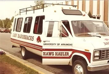 Then, what's with the weird spelling? A little something to do with being a proud Arkansas Razorback --particularly, a math education graduate, and a track and field hurdler. The Lady Razorbacks traveled in our own "Hawg Hauler". . .that thankfully got new graphics the next season!